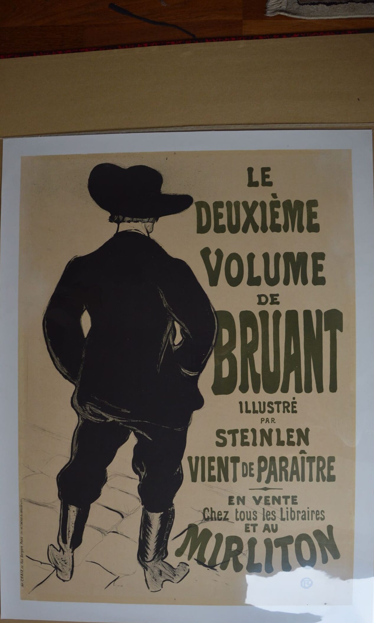 -Sur une version de cette affiche, on voit le chansonnier avec un texte annonçant l’ouverture de son nouveau cabaret (voir PAI-XLII, 495). Sur une autre, on fait la promotion d’un recueil de chansons de Bruant, illustré par Steinlen, et on nous rappelle que l’on peut l’écouter au Mirliton. Les deux affiches se distinguent par l’attitude insolente de Bruant : l’idée est que l’on reconnaît le célèbre artiste non seulement malgré le fait qu’il nous tourne le dos, mais grâce à cela. Qui d’autre oserait être aussi impoli ? Cette version de l’affiche d’Aristide Bruant fait la promotion de la vente d’un recueil de chansons de Bruant, illustré par Steinlen.