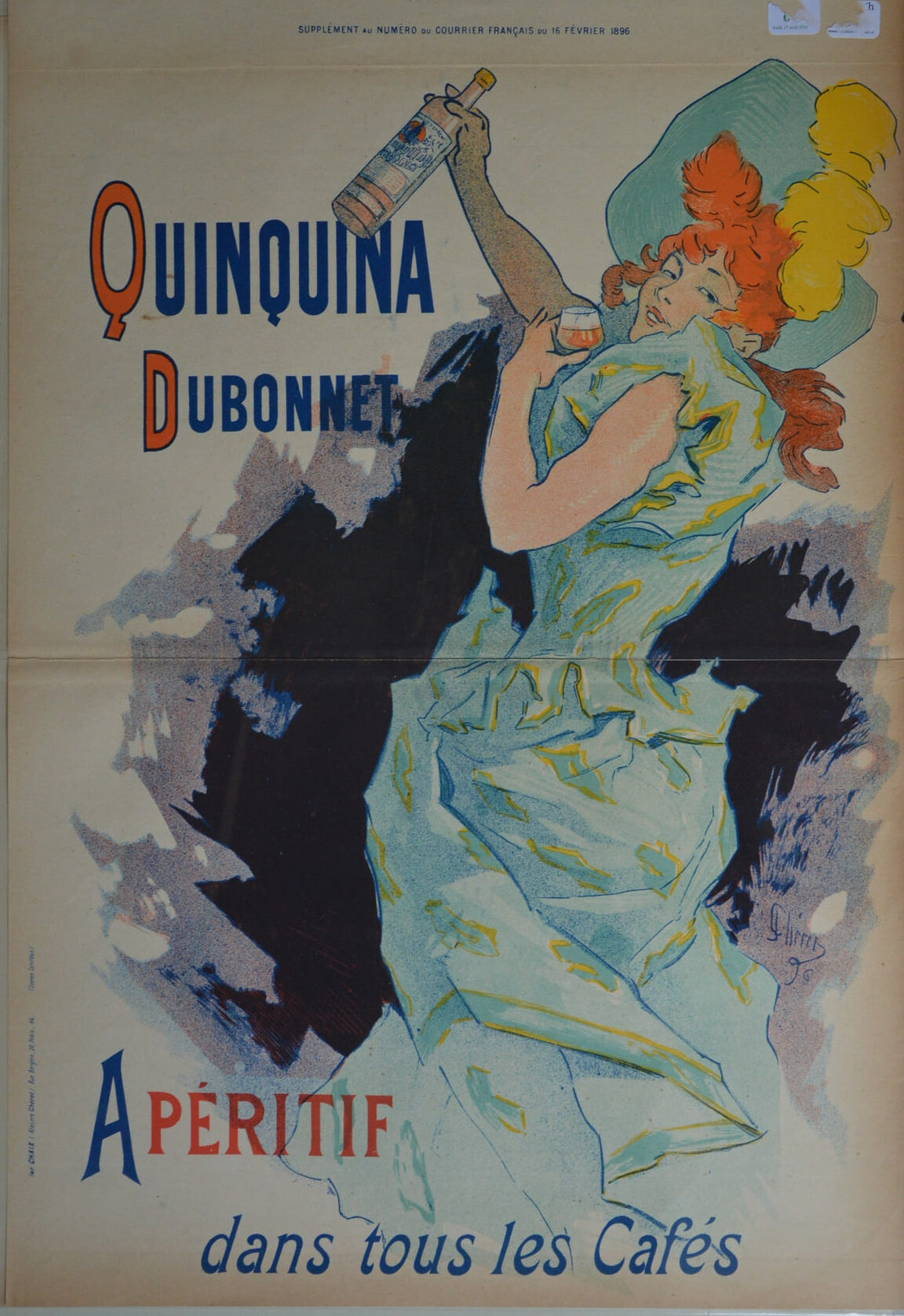 -Parmi les nombreux produits que la joyeuse rousse de Chéret promouvait figurait le Quinquina Dubonnet, un vin fortifié à base de plantes et de quinine. Dans cet encart du Courrier Français, on la voit trinquer au ciel tout en jetant un regard séducteur par-dessus son épaule au lecteur. L’illustration avait été conçue l’année précédente, mais elle parut dans l’hebdomadaire le 16 février 1896.