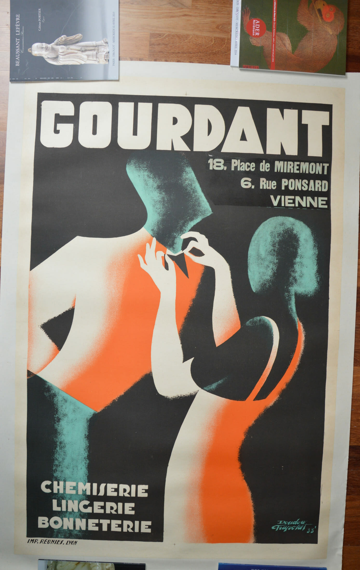 -Une magnifique affiche Art déco faisant la publicité des chemises, de la lingerie et des collants proposés par un grand magasin local.