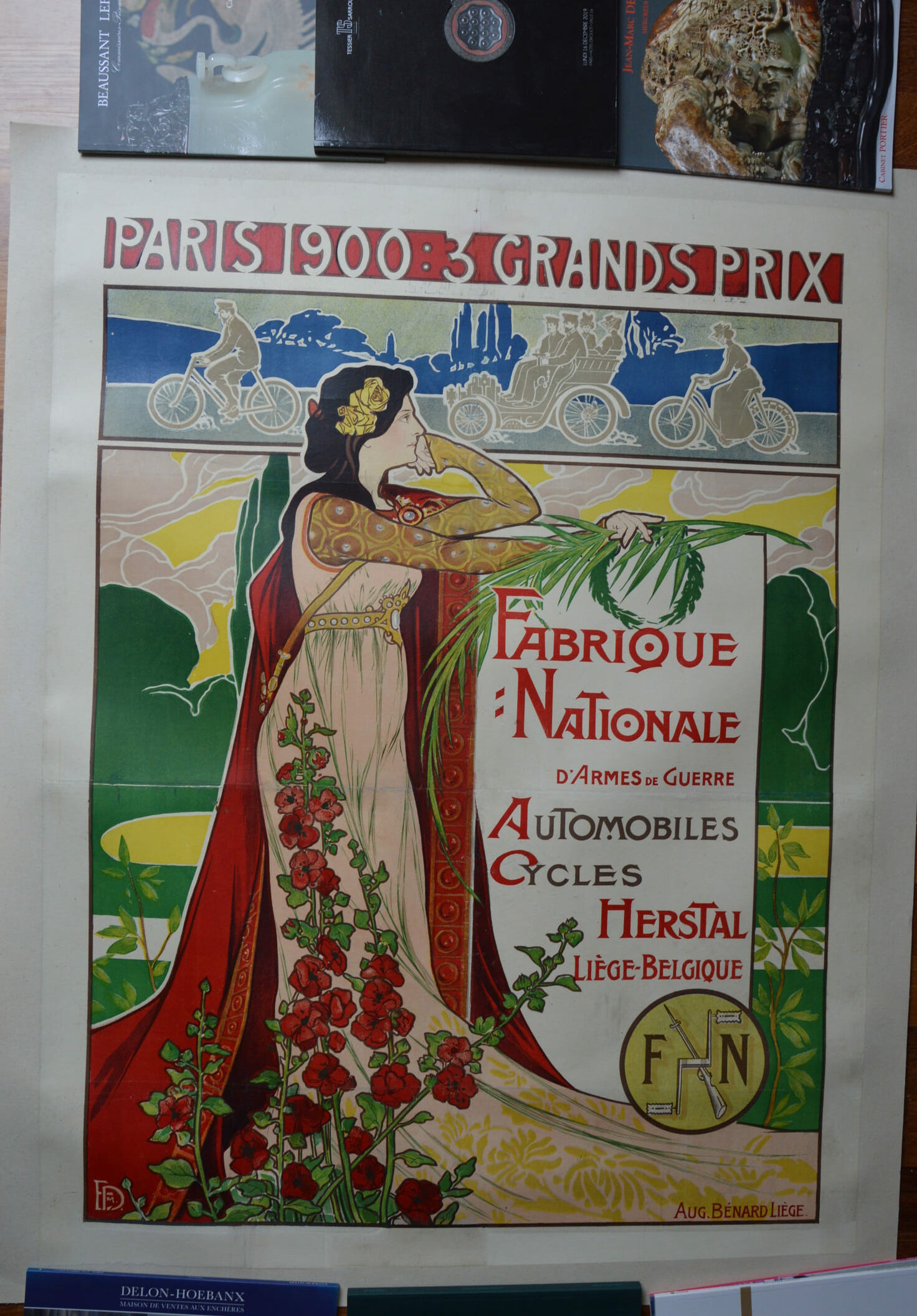 -Une allégorie byzantine quelque peu satisfaite d’elle-même, incarnation de la prouesse technique, tient le rôle principal dans cette lithographie Art nouveau à dominante florale, réalisée pour la Fabrique Nationale d’Armes de Guerre (FN) belge. Cette entreprise, qui produisait de tout, des bicyclettes aux armements, le symbolisait à juste titre dans son logo. Et pourquoi ne pas se permettre un peu d’exagération lithographique, puisque la FN a remporté trois Grands Prix à l’Exposition universelle de Paris de 1900, pour la production de bicyclettes, de motocyclettes et d’automobiles ? Bien que la production de l’entreprise soit réduite à un relief essentiellement ombré, la supériorité de cette dernière est amplement démontrée. Les initiales d’un artiste, « FD », apparaissent dans le coin inférieur gauche, mais aucune autre identification n’a pu être faite.